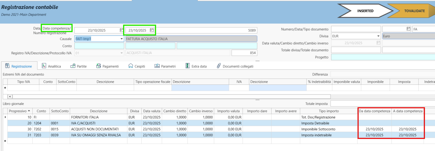 Nell'immagine: In verde la competenza contabile in testata registrazione sulla quale agisce il blocco in base lle date di filtro; in rosso la competenza economica che può essere bloccata opzionalmente.
