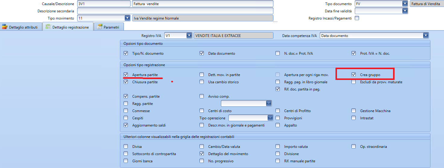 La cuadrícula inferior, muestra el eventual asiento automático vinculado al que está en uso: de hecho, con cada modificación del primero, el procedimiento continuará alineando el segundo según la lógica de las causales automáticas.