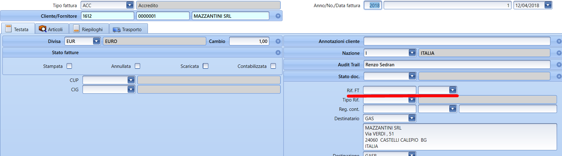 Cuando se contabiliza la nota de crédito, Fluentis intenta identificar el registro relativo a esa factura de origen para completar automáticamente este vínculo también a nivel de contabilidad (si estás en un registro manual de una nota de crédito, entonces también puedes establecer estos campos manualmente). Utilizado para el spesometro (antes de 2017) cuando tenía el límite de 3000 euros, para revertir las notas de crédito de la factura y no comunicar la operación. Actualmente ya no se utiliza.