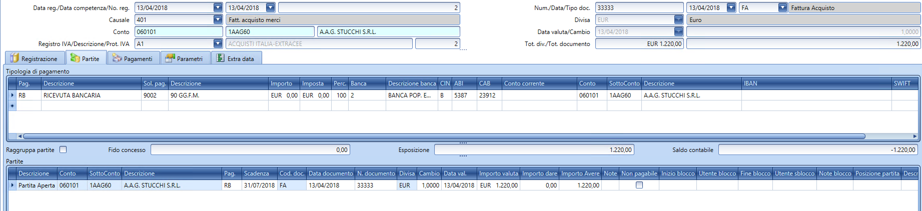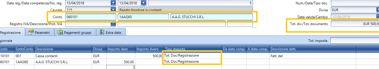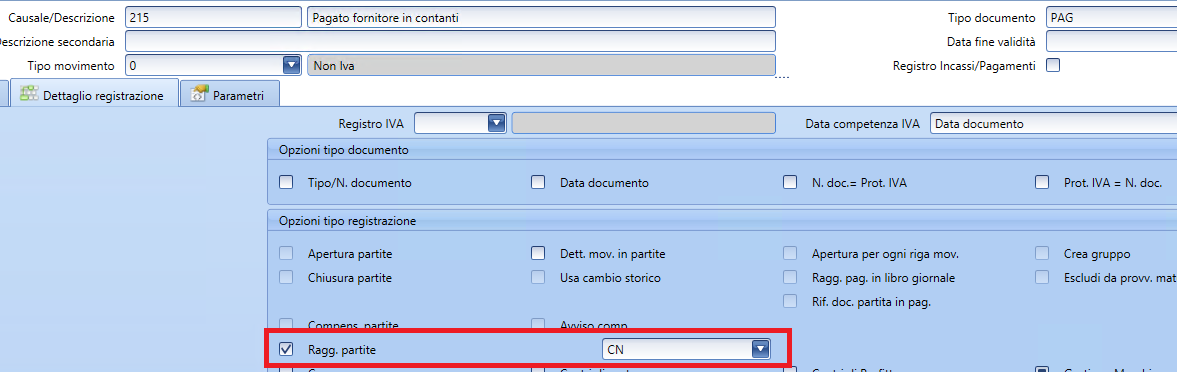 Cuenta Partner: (OBSOLETO) campo para ingresar (mediante el widget de búsqueda de cuentas) una subcuenta ya codificada en el maestro de datos; útil para memorizar, por ejemplo, el nombre del proveedor extranjero en una DDT aduanera, la cual suele ser ingresada con referencia a un maestro de datos con información genérica respecto al sujeto "aduana" (esto con el fin de cumplir con las modificaciones normativas en el spesometro según las cuales desde 2018 ya no se permitía pasar los datos de la aduana, de la cual a menudo no se tienen referencias fiscales y se utilizaba en lugar del número de IVA el relleno XX-99999999, donde XX corresponde al código ISO internacional del país del sujeto).