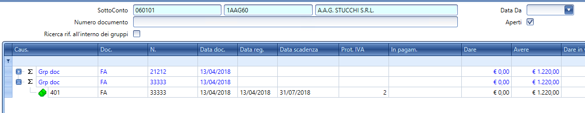 Operativamente, la aplicación creará, en cada una de estas partidas, los respectivos pagos recíprocos (y es por esto que la lectura de un calendario de vencimientos ‘estándar’ ya no será clara y se deberá utilizar solo los informes y las pantallas de visualización/gestión de los agrupamientos para tener una visión clara de los auxiliares). Cuando el saldo del grupo, como resultado de las distintas partidas asignadas, llegue a 0, entonces el grupo pasará automáticamente al estado ‘cerrado’.
