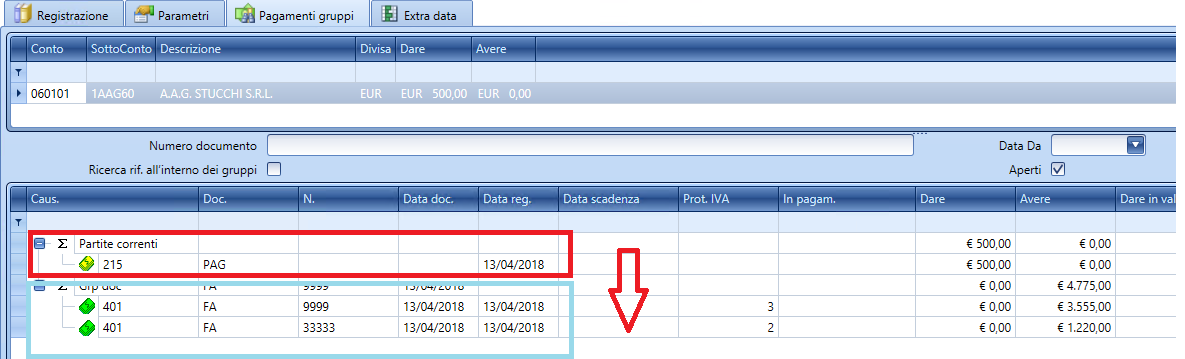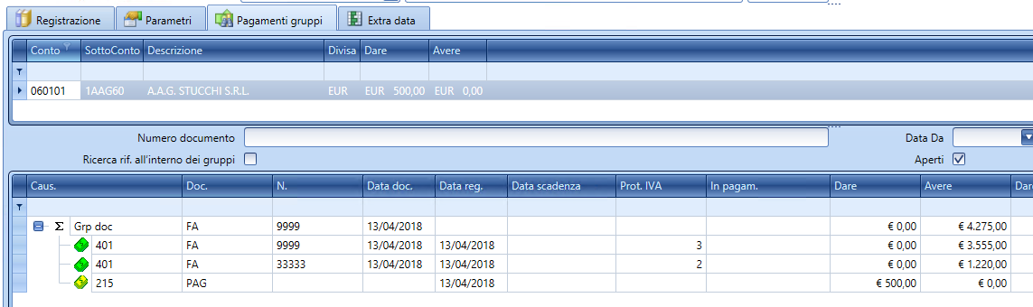 En este punto, la operatividad del usuario en los registros de cobro/pago es completamente diferente a la de un cierre de partidas normal: en este caso, de hecho, el usuario comenzará el registro desde la pestaña Registro, imputando directamente un valor al pago/cobro (mediante la cumplimentación de las secciones del asiento), sobre el cual la aplicación creará igualmente una partida deudora/acreedora que el usuario procederá luego a asignar manualmente (si lo desea) a un grupo desde la pestaña ‘Pagos de grupos’.